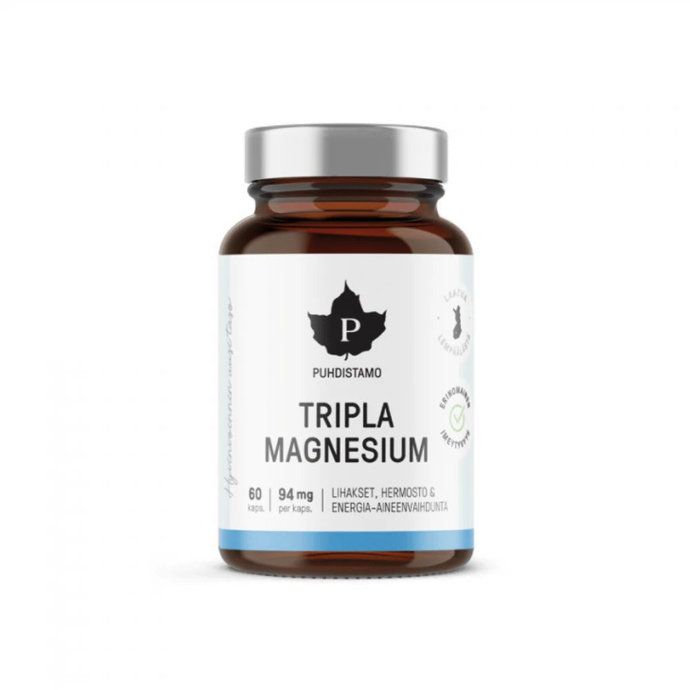 Trigubo magnio sudėtyje yra trys aukščiausios kokybės magnio formos: magnio malatas, magnis bis glicinatas ir magnio tauratas, todėl Puhdistam Triple Magnesium yra unikalus produktas. Šis produktas yra lengviau virškinamas ir pasisavinamas nei įprasti magnio papildai.